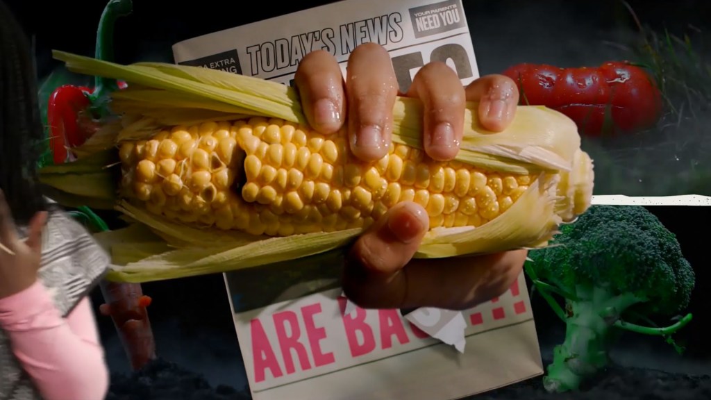Some rowdy kids are taking on some villain vegetables. Eat them to defeat them. A fun film directed by Zac Ella. I was responsible for the opening shot, compositing the vegetables in the wide shots, adding faces to some of the vegetables and removing buildings in background.